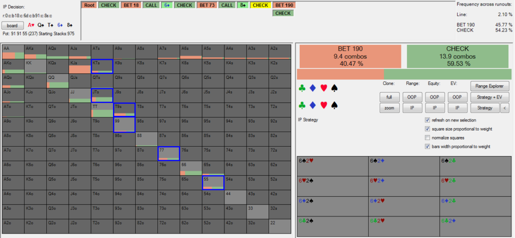 因为策略树的探索深度,Solver软件能够用相对多的有利可图诈唬牌组合打到河牌圈。你可以看到它用一些口袋对子(55,77,99)和一些翻牌圈底对(KTs,JTs,T9s)下注两次,而且这些牌现在将以一定频率下注。