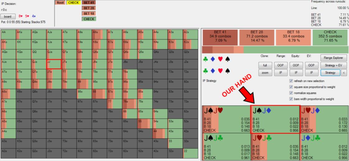 Solver软件希望在96%的时候用我们的特定底牌(J♠ J♦)check。我们可以猜测为什么: