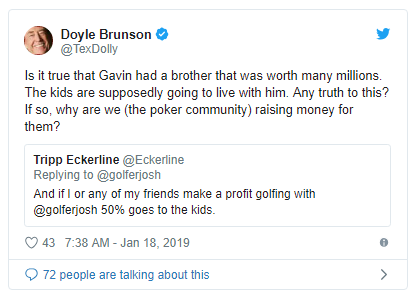 Gavin去世的消息刚传出,Arieh就立即通过GoFundMe筹钱。有人在推特上提出一名累积奖金超过600万美元的扑克玩家有什么理由筹钱。Doyle Brunson就是其中之一。推特大意:Gavin有个身价百万的兄弟是真的吗?孩子今后肯定是跟着他这个兄弟生活了呀。这一切有假吗?如果是真的,我们有为他家人筹钱的必要吗?