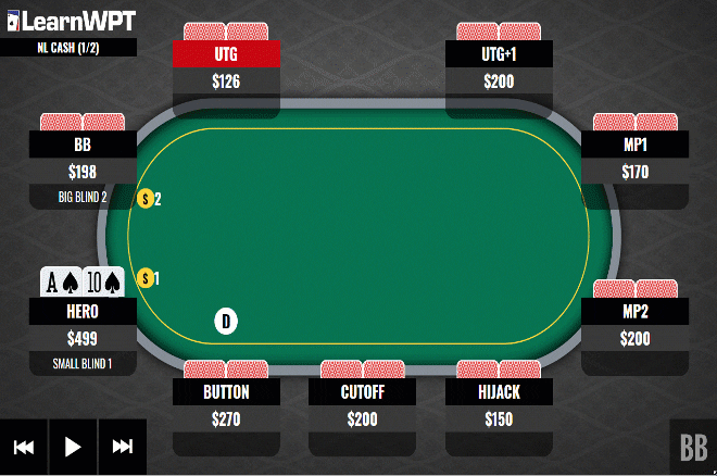 我们在小盲位置用同花AT补满去对抗多个对手是非常合理的。我们的底牌非常适合游戏多人底池,但它没有强到翻前高兴地打光所有筹码(如果枪口玩家在我们加注之后limp-reraise全压)。