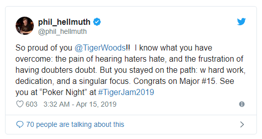 英雄都是惺惺相惜的,也许就是没人比Hellmuth更能懂得在一个看似不可能的年龄打破世界纪录的心情,他在第一时间对泰格伍兹的胜利送上了祝贺。
