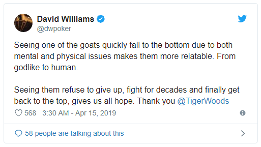 2004 WSOP主赛亚军David Williams承认自己早前对高尔夫并不感兴趣。他说自己16岁的时候根本不会看和高尔夫相关的东西。但和很多人一样,他是在后期受泰格伍兹的影响慢慢的喜欢上了高尔夫。