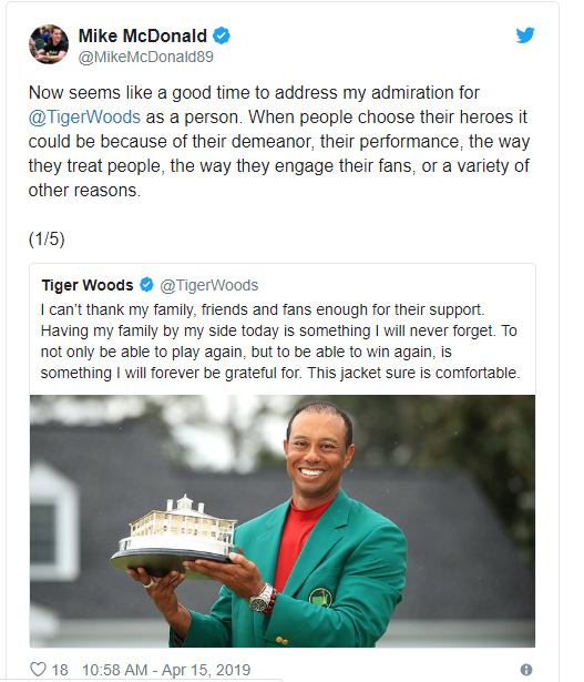 大意:此刻我想表达的就是我佩服泰格伍兹的原因。大家都有自己选择偶像的标准,有些是看外表,有些是看表现,有些是看他们的为人处事,有些是看他们对待粉丝的方式等原因。