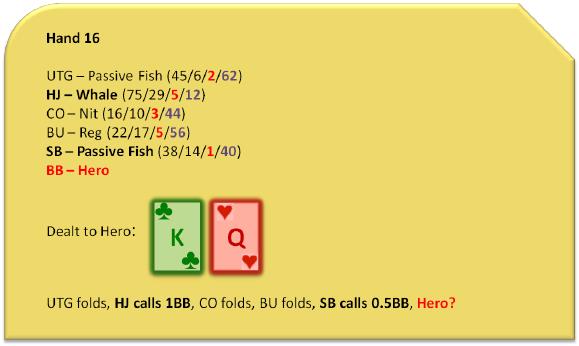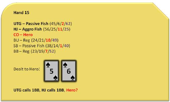 这手牌的常见牌力与牌例14的底牌相似,只是因为翻牌圈拿到顶对的能力较弱而稍微弱一点。牌局中已有两个跛入者,其中一个似乎非常讨厌在翻后弃牌。此外,盲注位置的另一个鱼玩家使得Hero加注后更可能进入三人底池或四人底池,更不用说一个对Hero有位置优势的、3bet频率10%的常客玩家。最后,Hero的位置还算可以,但它不足以使隔离加注是最好的玩法。