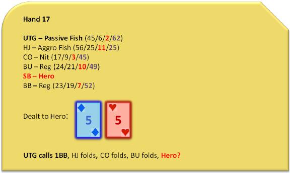 那么我们能够跟注吗?大多数时候我们只用跟注半个大盲注去看翻牌。因为暗三条潜力,55有良好的潜力底池赔率,当底池赔率这样好时,投机暗三条是可行的。此外,鉴于被动的鱼玩家通常没拿到好牌不会下注,我们也许能够在摊牌时获胜。这手牌应该补满就好。