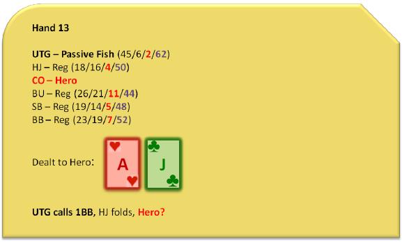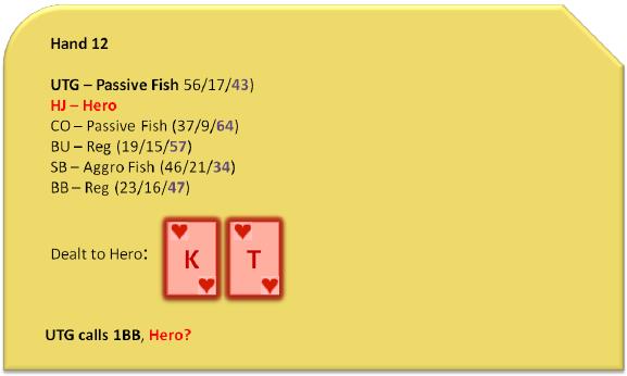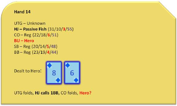 这里的常见牌力不是很好,但拿着一手中等隔点同花连子也算不上很糟。我们的弃牌赢率很好,因为后面没有特别活跃的牌手,而且跛入者在55%的时候对持续下注弃牌。最后,按钮位置是Hero可能坐到的最好位置,即使其他牌手跟注,Hero也将总是翻后最后行动的人。