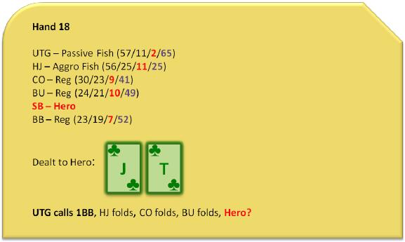 这个场合类似于牌例17,只是我们ISO三角的最重要因素有一个根本差异:我们的常见牌力好了很多。这手牌强到足够做隔离加注。它将足够频繁地在翻牌圈拿到一些牌力来平衡位置劣势,采用不中即弃牌策略的鱼玩家在我们没有和翻牌产生联系的时候将帮到我们。