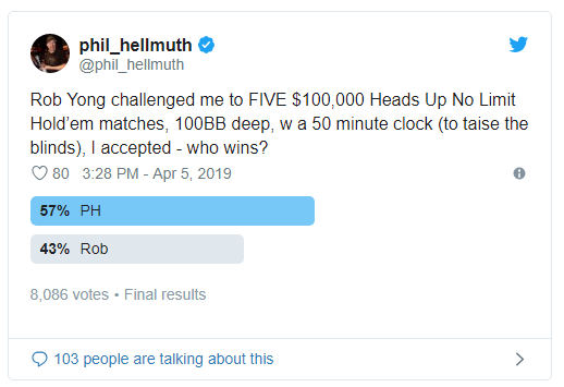 大意:Rob Yong将挑战我五场$100,000单挑无限德州扑克。100BB,时长50分钟,我完全接受,你们认为谁会赢?