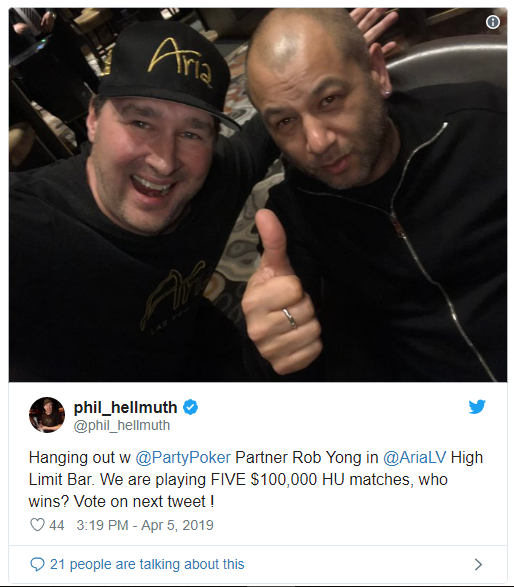 大意:挂一张我和partypoker合作伙伴Rob Yong在拉斯维加斯阿瑞尔酒吧的照片。我俩准备来五场$100,000单挑决斗,谁会赢?下一条推特开始投票!