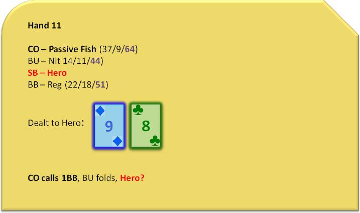 这是一种完全不同的情况,也说明了位置的重要性。虽然我们在这里对抗初始跛入者仍然有很好的弃牌赢率,而且有着同样的常见牌力,但现在大盲位置有一名对我们有位置优势的常客玩家。这使得我们难以和鱼玩家单挑,因为大盲玩家这里可能跟注我们的隔离加注,甚至利用他的位置优势频繁对我们3bet。此外,当Hero真的和鱼玩家在翻后单挑时,他不得不解决在每个回合首先行动的难题,也丧失了他在牌例10中具有的优势。
