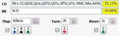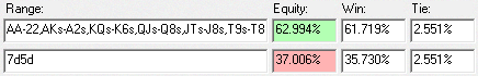 为了做这个评估我们输入对手的范围和你的底牌到胜率计算器,但首先我们需要推测你对抗的范围。