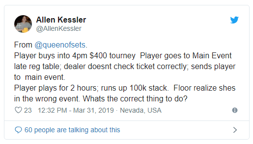 大意:玩家报名$400买入的比赛却坐到了主赛桌子上,荷官都不认真检查玩家信息的吗?打了差不多2个小时,筹码量上升到了100k。赛场总监发现不对头将她赶出现场有什么不妥吗?你们认为正确的做法应该是什么?