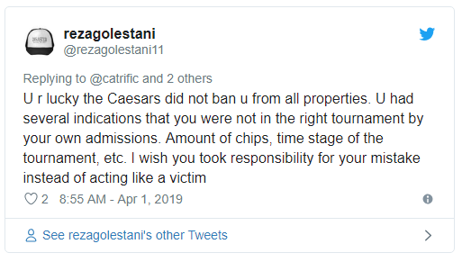 大意:你应该感到幸运,因为凯撒置业并没有把你拉入黑名单。你也承认了在最开始的时候就有感到不对劲。起始筹码,赛段时长等应该让你反应过来才对。我希望你能为自己的行为负责任,而不是扮演一位受害者。