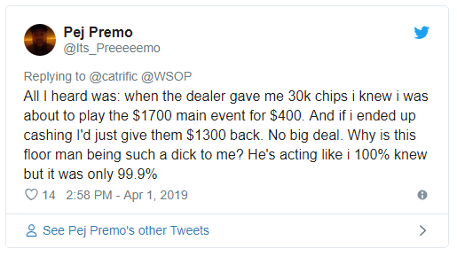 大意:根据我听到的翻译一下:荷官给我30K筹码的时候我就知道自己花$400进入到了$1700主赛牌桌上。如果我打入了钱圈,那么至少可以收获$1300奖金。这又有什么。赛场工作人员为什么要如此对待我?他们以为我从头到尾都知道,其实我是后面才知道的。