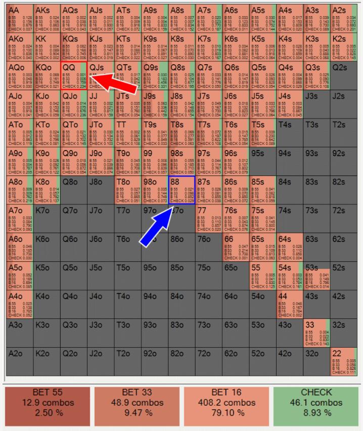 现在你知道为什么在这种场合用88下注比用QQ下注更重要,即使88是一手较弱的牌。这一点也在solver软件中反映出来。如下图所示,88的下注频率比QQ更高。