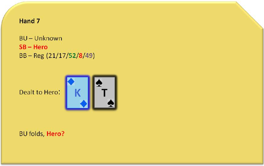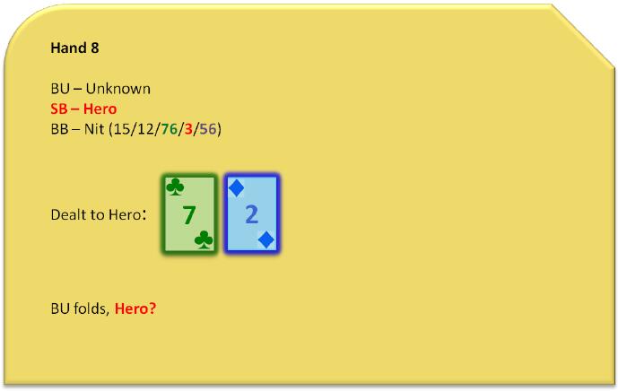这里我们的弃牌赢率远高于RFE,但如我们在牌例6所见,那并未确保我们应该率先加注。它只意味着率先加注在真空情况下很可能是明显+EV的,但记得在牌例6中我们的对手是意识良好的常客玩家,他们会很快通过较少弃牌来适应过宽的率先加注策略,惩罚我们超激进的偷盲玩法。有时我们也不得不考虑将来的弃牌赢率。如果我们用边缘+EV牌率先加注,我们可能因为将来的弃牌赢率减少而损失大量EV。