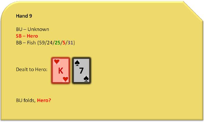 同样,我将推荐一个信息极其有限场合的缺省范围。但如同在上一节,在小盲位置率先加注是一个非常动态的局面,我们率先加注的要求主要取决于对手。Hero的HUD数据和他的判断能力在这里是他的两个最好朋友。