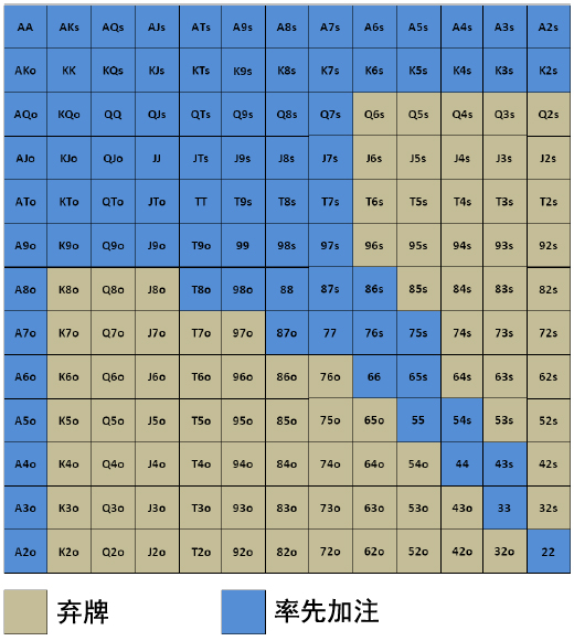 如同之前的几个位置,如果你经常参与的牌局特别紧或特别被动,你应该考虑做比这个缺省范围更宽的率先加注。相反,如果你的对手们非常激进,而且喜欢3bet,那么紧起来是合理的。