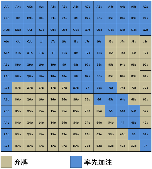 我们只有在完全缺乏盲注玩家信息时才采用以下范围。快速浏览下面的表格,将它打印出来作为参考,然后重温上面的六个牌例。它们非常重要!