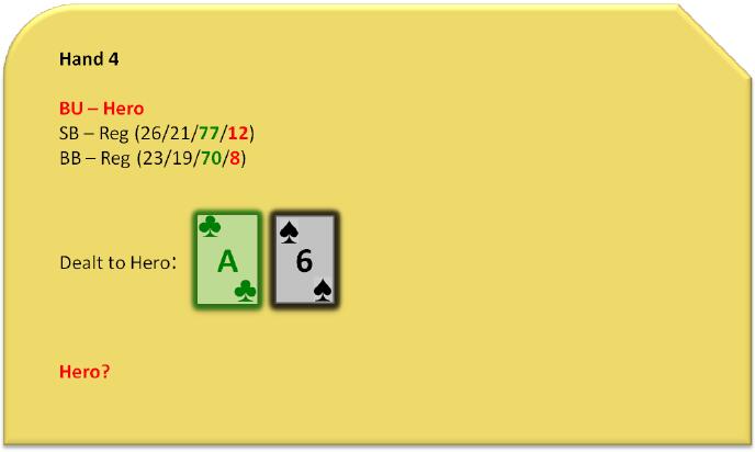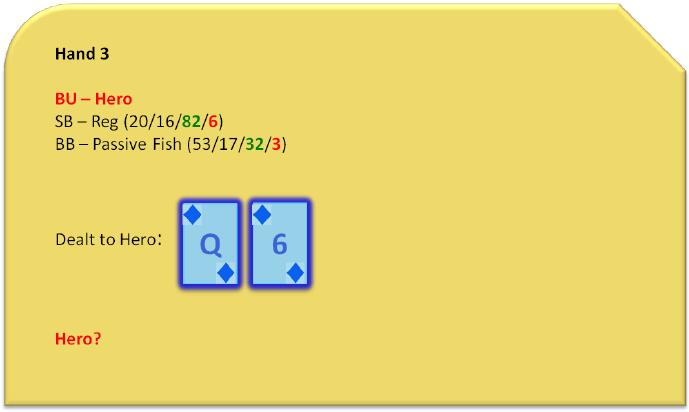 牌局2的第四个数字(红色标示)是指对手的翻前3bet统计数据。如我们刚刚所学,当我们决定用多宽的范围偷盲时,这个频率变得非常重要。