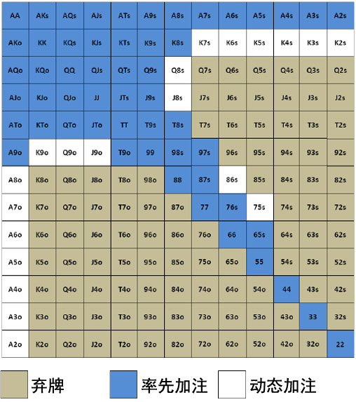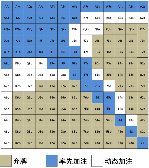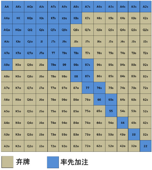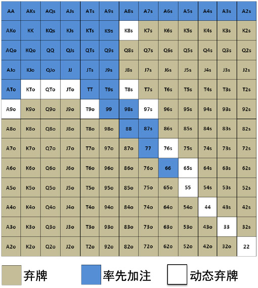 2. 作为半偷盲:这些劫位范围的扩展部分当然会保留。简要陈述一下,这些牌是很好游戏但为了有利可图的率先加注需要在翻前或翻后有一些弃牌赢率的牌。