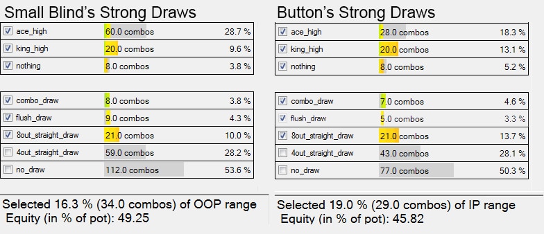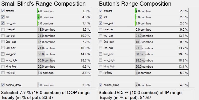 你的范围中存在7.7%的超强牌组合,而对手的范围中存在6.5%的超强牌组合。因此,你稍占优势,但并未打破平衡。