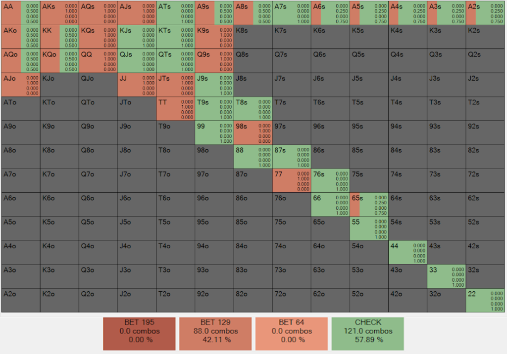 在这个干燥翻牌面,PIOSolver在69%的时候持续下注,且主要是33%底池大小的下注。
