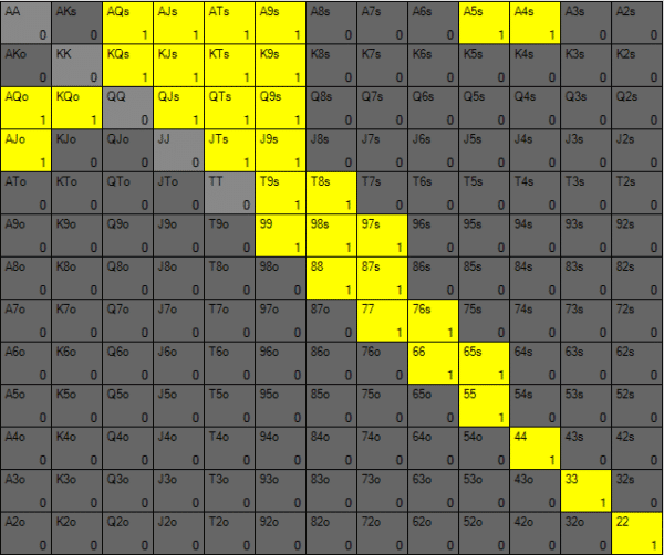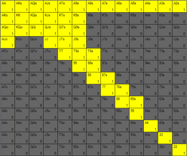 如下图所示,你在翻牌圈的范围是{22+,A2s+,K9s+,Q9s+,J9s+,T8s+,98s,87s,76s,65s,AJo+,KQo}。