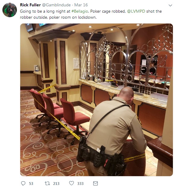 Rick Fuller,曾是警官的他已经打了10多年的牌,他拍了一张案发后现场的照片。(推特大意:注定是一个漫长的夜晚,柜台被抢,歹徒被制服,现场被封。)