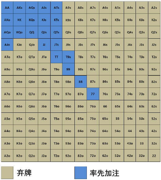 以下范围假定牌局中没有用频繁再加注攻击我们率先加注的超凶常客玩家,也没有任何被我们锁定的盲注位置鱼玩家。本章的每个缺省范围都适用于不存在这类条件的普通低注额、微注额牌局。如之前所述,这些范围对初学者很友好,而更能干的牌手可以做比这里的建议更宽的率先加注。