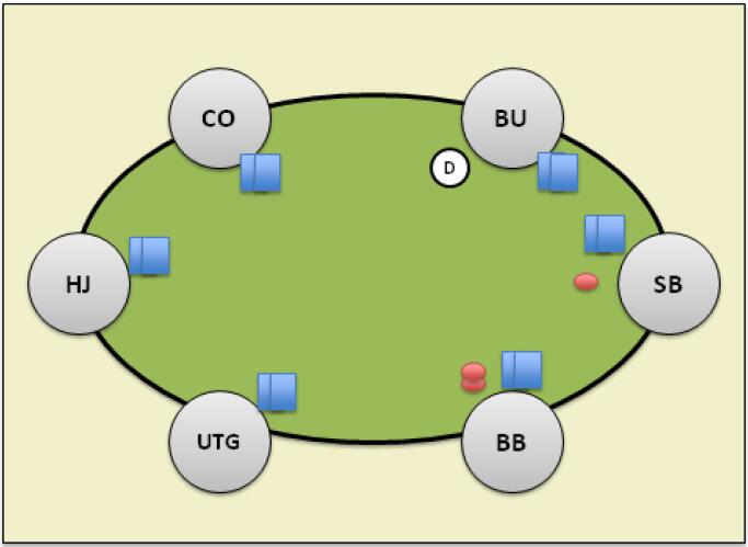 从现在开始,当我提到一个位置时,它总是在这种少人桌形式。每个位置名称总是指相对于按钮位置的同一个位置。