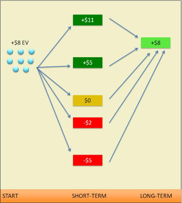 假设我一天下午在微注额级别打了一个500手牌的session,我所做的每一个选择总共让我在EV上赚到了8美元。短期而言,那个session存在大量可能的金钱结果。事实上,这张图没有充分表述出这里存在多少种不同的可能性。有些日子我赚到超过8美元,有些日子我的盈利不到8美元。更少的时候,在这个小样本例子中扑克天生的波动与我作对,我甚至会输钱。我的EV仍然是+8美元,而真正结果取决于运气。