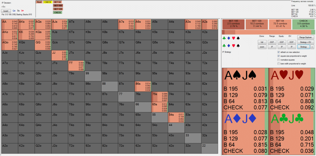 现在,我们来看看PIOSolver软件给你的游戏建议(假设CO玩家在Q♥ J♥ 8♠翻牌面check):