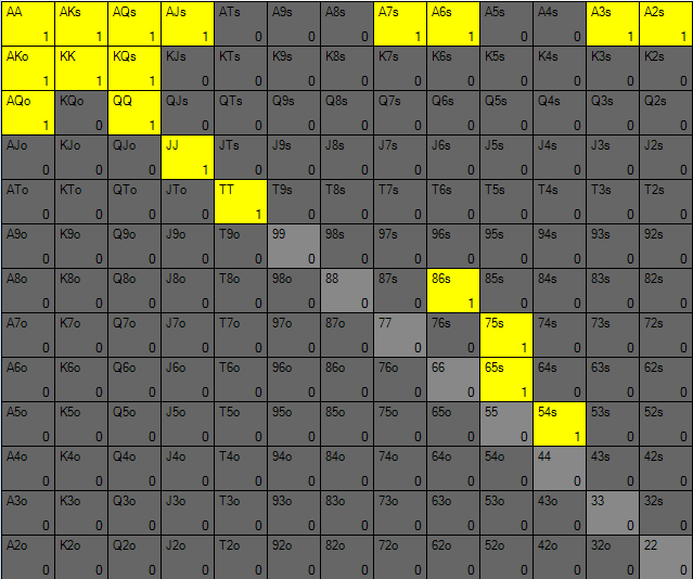 如下图所示,你在翻牌圈的范围是{TT+,AJs+,KQS,AQo,A7s,A6s,A3s,A2s,86s,75s,65s,54s}。