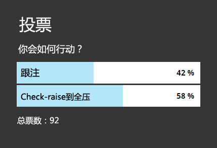 转牌Q♦给了我们的对手更多和公共牌面产生关系的方式(例如他拿着AQ或KQ),而且他极狭窄的范围仍然包括高对。Check-raise到全压是非常合理的,因为这类对手往往将在河牌圈随后check,而不是寻求三条街的价值。