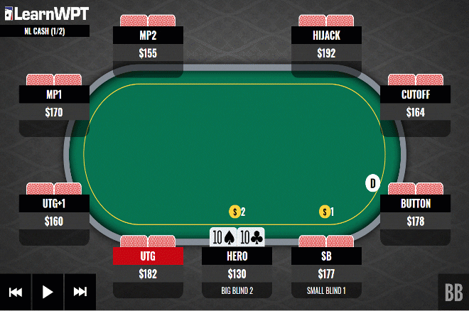这手牌来自一个盲注1/2美元的无限德州扑克常规局。桌上玩家筹码量如图。翻前,三名牌手跛入,一名紧手在MP2位置加注到10美元,劫位玩家和CO玩家跟注,你在大盲位置用10♠ 10♣跟注,然后两个跛入者也跟注。