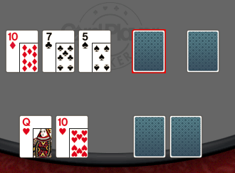 假设某人(100BB筹码)在中间位置加注到3BB,某人在按钮位置跟注,你在大盲位置用Q♥ T♥跟注。翻牌是T♦ 7♣ 5♠。