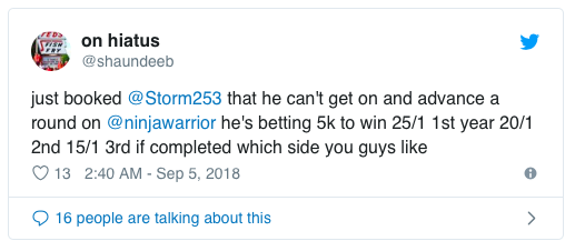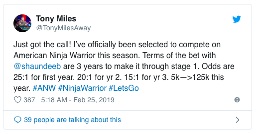 两周前,Miles和大家分享了一则好消息:他已经接到节目方的邀请挑战通知,对赌挑战正式开启。推特大意:刚刚接到电话,我已经正式被邀约挑战本季的《美国忍者勇士》。和Deeb的对赌周期是三年,第一年完成赔率25:1,第二年20:1,第三年15:1。