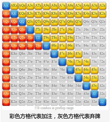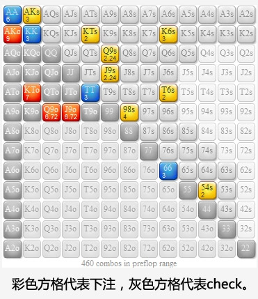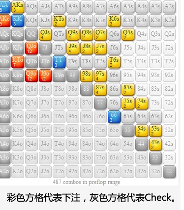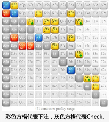 我们的翻牌圈下注范围包括41种价值牌组合和80种诈唬牌组合。这个比率接近我们在翻牌圈力求达到的2:1诈唬价值比。