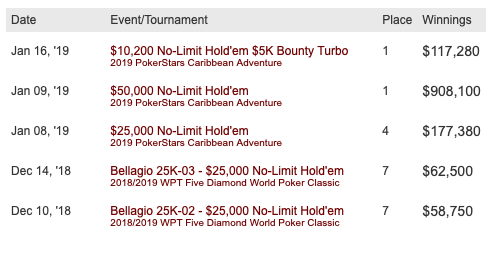 Kempe目前线下锦标赛累积奖金超过1900万美元。1月9日取得了PCA $50K单日豪客赛冠军(奖金$908,100),1月8日还取得了PCA $25K无限德扑赛事的第4名(奖金超过17万美元),Kempe在2019年伊始就给自己开了个好头。