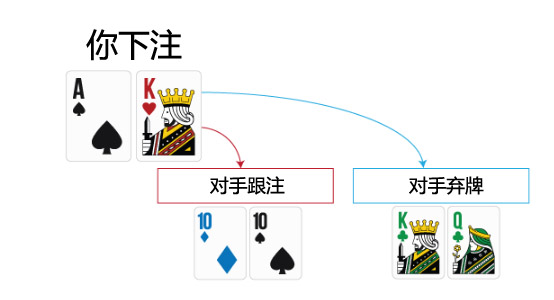 在本例中你认为对手将在一半的时候弃牌。那么你应该下注,对吗?未必。你需要考虑如果你check将会发生什么。在这种场合存在一种更有利可图的玩法吗?你在对抗哪种类型的牌手?对手会考虑你的牌力吗?