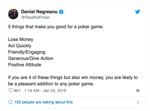 Daniel Negreanu日前在推特上分享了他个人认为适合打牌和不适合打牌玩家们的各自5个特点。抛开打牌本身,很多人都感觉他的言论过于“傲慢”。