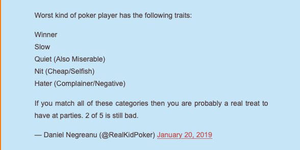 丹牛首先说的是有哪些特点的人不利于打牌。针对“最糟糕类型的扑克玩家”他给出了5个特点。(该条推特后来被丹牛删除)