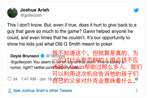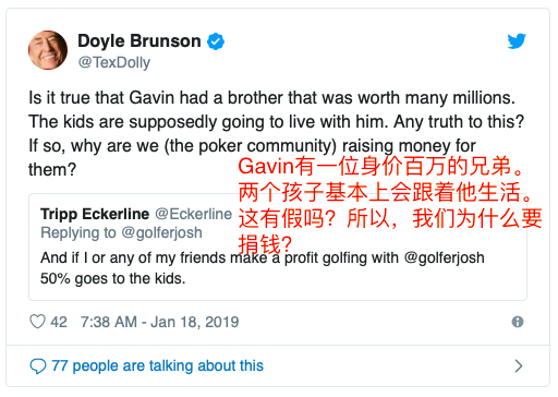 Doyle Brunson声称Gavin Smith的兄弟有钱,因此他好奇扑克圈为什么要为Gavin Smith的孩子捐钱。他们的言论在推特上也得到了很多人的认同。