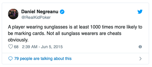 Daniel Negreanu对此也颇有微词。抛开识别对手马脚不谈,丹牛在2015年发推表示墨镜的存在会潜在导致比赛的不公平性。