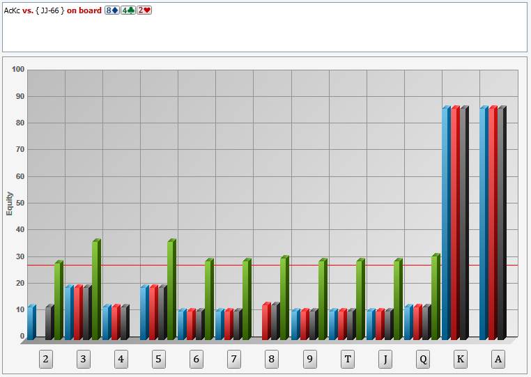上图显示了AK在各种不同转牌发出时的胜率。所有可能的转牌在底端的X轴标示,而不同花色用不同颜色的柱条表示。
