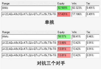 这是一个你应该首先仔细思考接下来会发生什么的场合。一旦你在翻前得到两个、三个或四个跟注,你应该不再对自己的牌感到兴奋。因为有多个跟注,AA的胜率显著降低。我们来看看AA在单挑场合和多人底池场合的胜率情况: