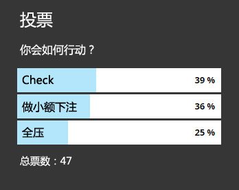 如果我们手中有一张A♥,我们可以下注小一点,或者在这个转牌面check。但是,由于没有拿到A♥,我们应该在转牌圈直接全压。