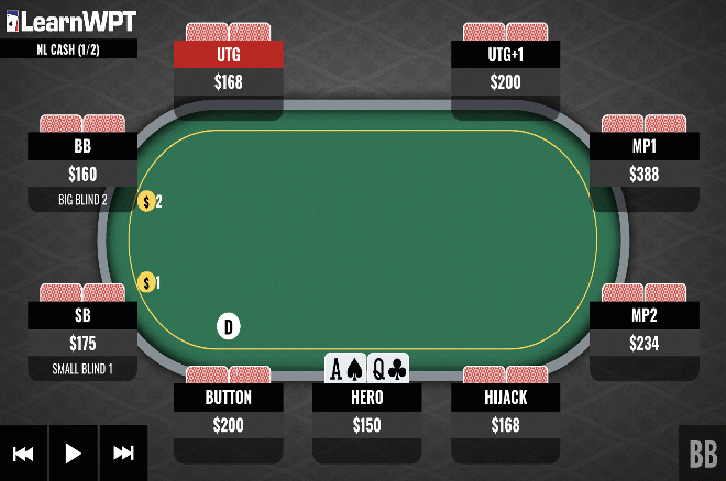 这手牌来自一个盲注1/2美元的无限德州扑克常规局。桌上玩家筹码量如图所示。翻前,MP1玩家率先加注到6美元,你在CO位置用A♠ Q♣再加注到18美元。按钮玩家跟注,两个盲注玩家和MP1玩家都弃牌。底池现在有45美元。翻牌是Q♥ 5♥ 6♦。你下注22美元,按钮玩家跟注。底池现在有89美元,你还剩下110美元筹码。转牌是9♥。现在轮到你行动,你会如何行动?Check?小额下注?全压?