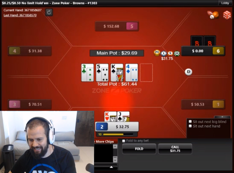 因此,Fee似乎不高兴地说:“伙计们,我觉得这里除了跟注别无选择。也许我们在一个3bet底池用顶对做hero fold?可能不会,在这种场合这手牌太强了。”